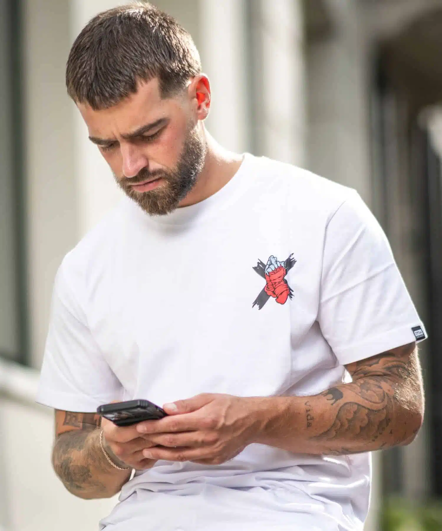 Aan de voorkant, net boven je hart, pronkt het “Pray for My Enemies” logo. Draai je om en hetzelfde krachtige logo wordt groots weergegeven op de rug. Het logo toont een kruis met daarin een hand gewikkeld in bandages, die een onmiskenbare middelvinger opsteekt. Een statement van kracht en vastberadenheid.
