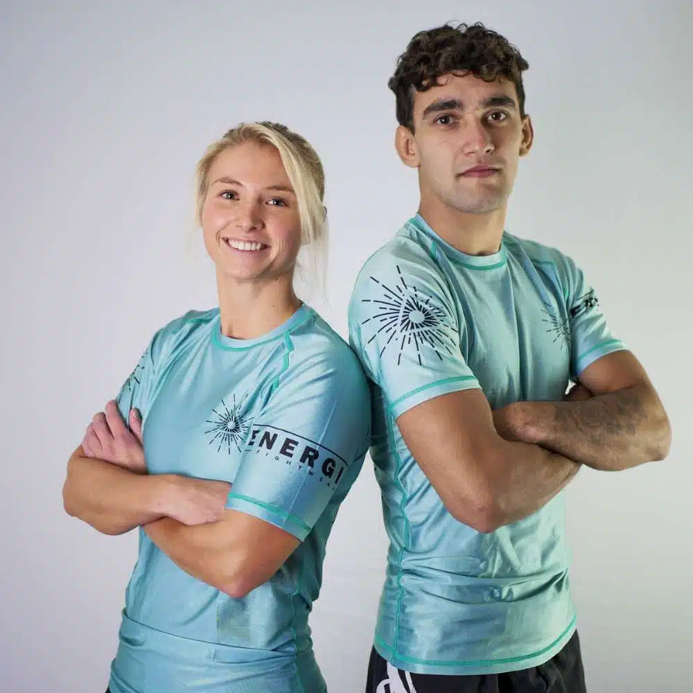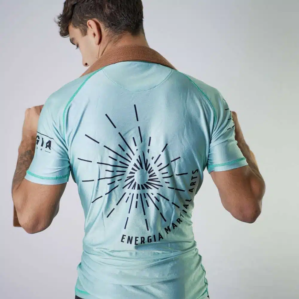Een nieuw soort rashguard: Lichter, dunner en subtiel ‘shiny’, met een unieke groen/blauwe kleur.