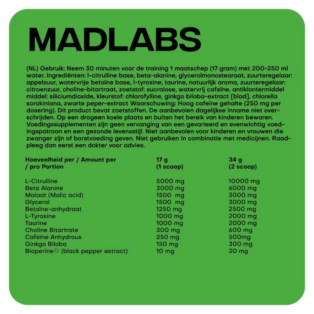 MADLABS helpt jou je prestaties naar een nieuw niveau te tillen en daadwerkelijk het uiterste uit je trainingen te halen. Dankzij onze unieke formule hebben wij de ideale mix tussen meer kracht, meer uithoudingsvermogen en meer focus weten te behalen terwijl wij de ongewenste bijwerkingen van een sterke pre-workout hebben weten te minimaliseren. Dit product is niet enkel voor de amateur, maar ook voor gevorderde sporters ideaal en helpt je plateau’s te overstijgen om nieuwe hoogtepunten te bereiken in jouw sportcarrière.