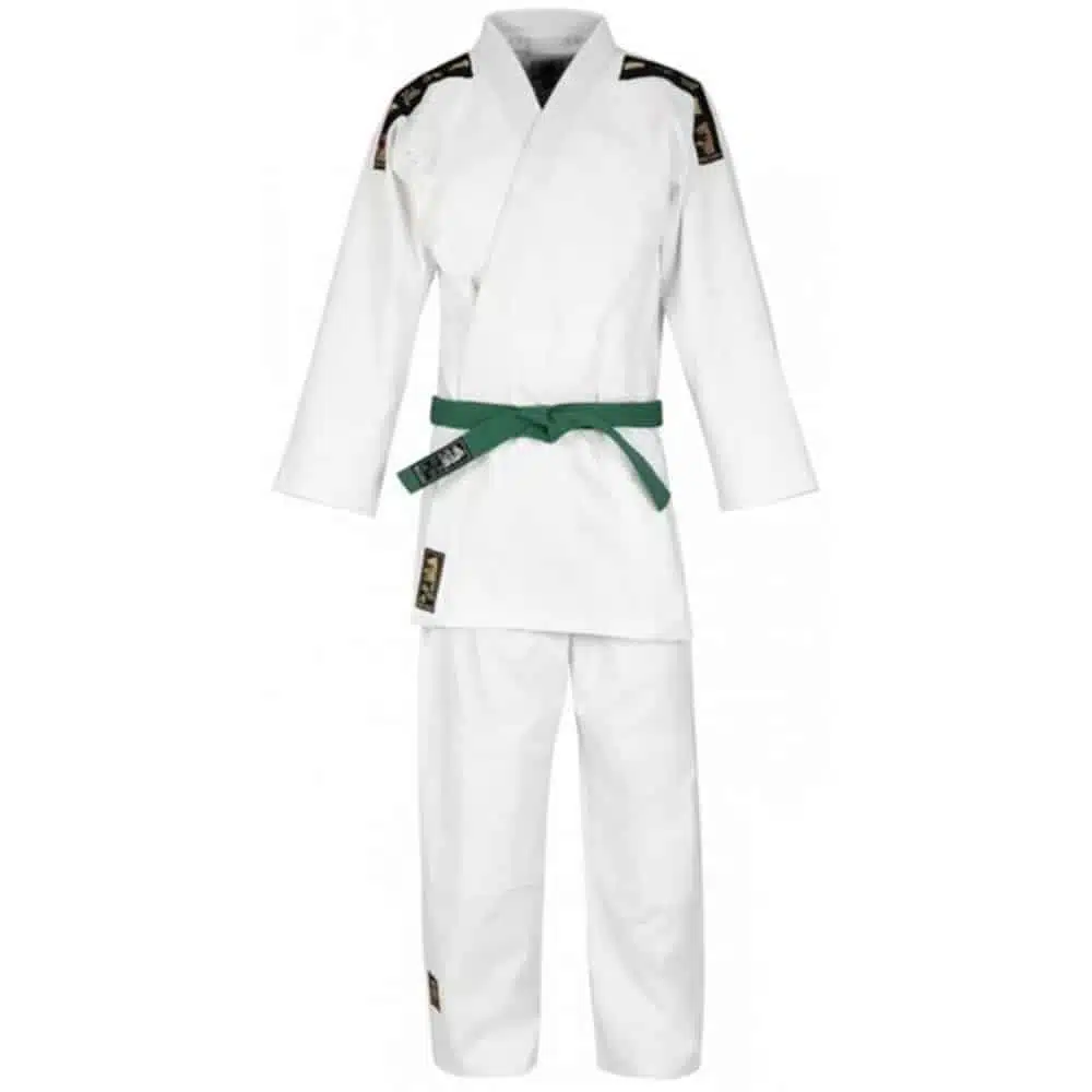 Het Judo Club Met Label pak is vervaardigd uit 100% gewafeld katoen met een gewicht van 450 gram, waardoor het stevig en comfortabel aanvoelt tijdens trainingen en wedstrijden. De stijlvolle zwart-gouden schouderlabels met judotekens geven het pak een professionele uitstraling.