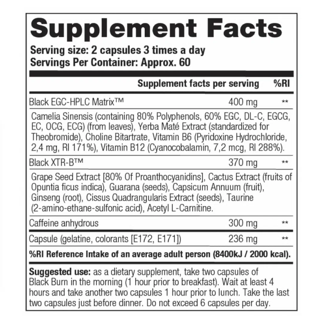 Gebruiksaanwijzing: Neem voor iedere hoofdmaaltijd 2 capsules Black Burn, dus 2 voor het ontbijt, 2 voor de lunch en 2 voor het avondeten. Neem maximaal 6 capsules per dag.