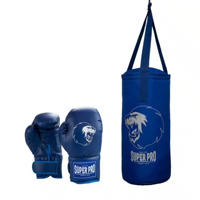 De Super Pro Combat Gear junior boksset bestaande uit een bokszak en een paar 6oz handschoenen.