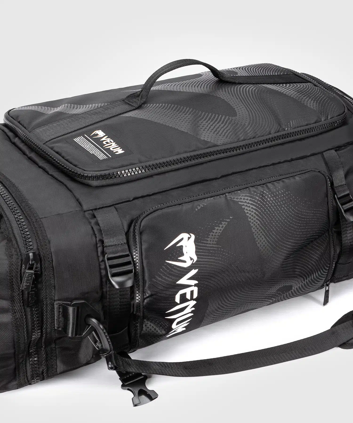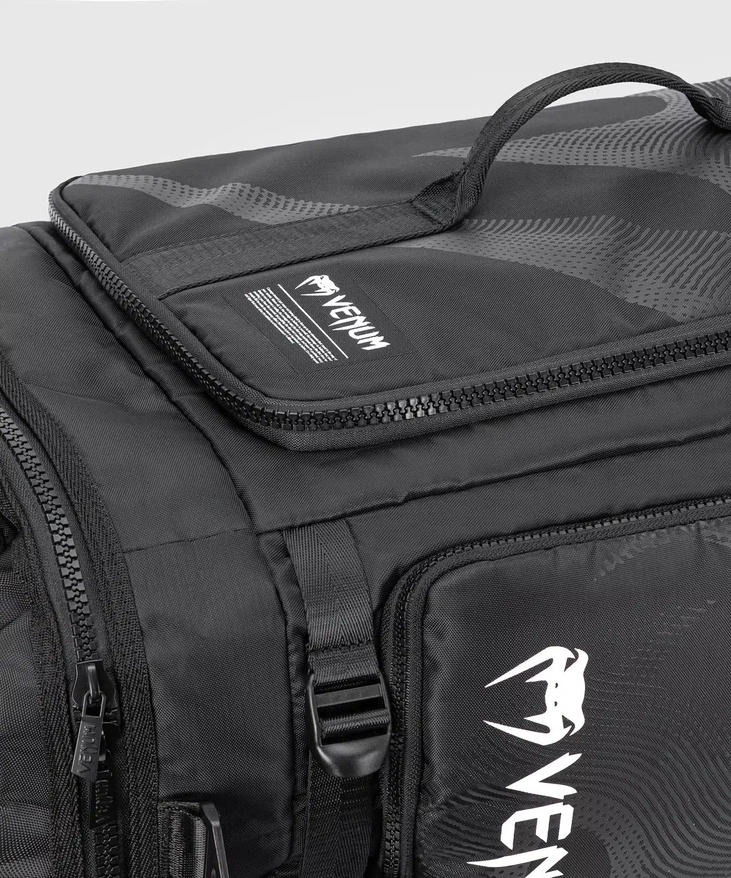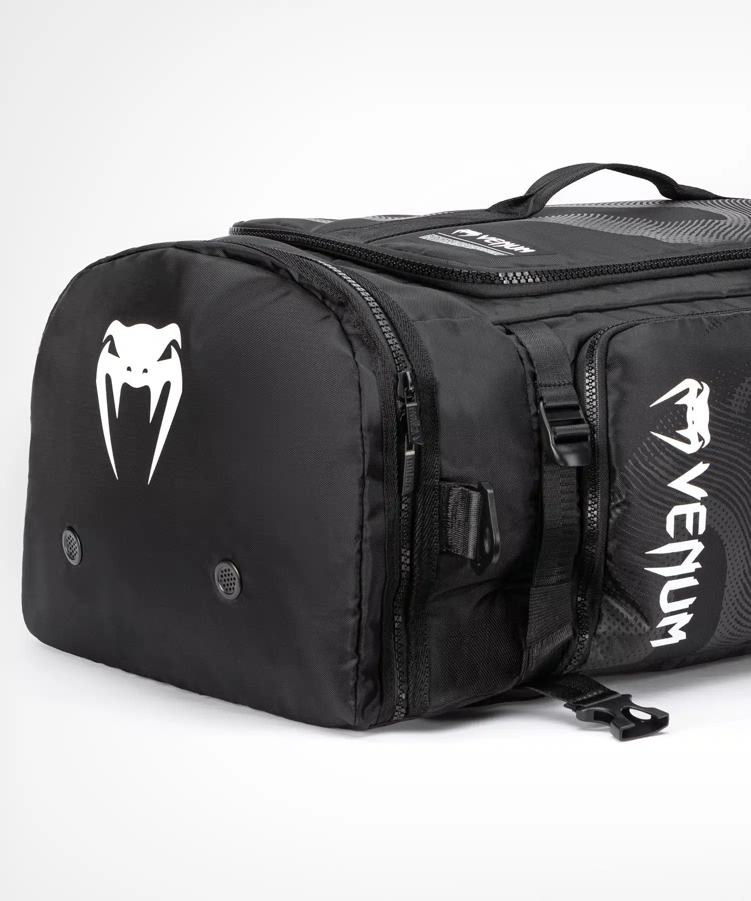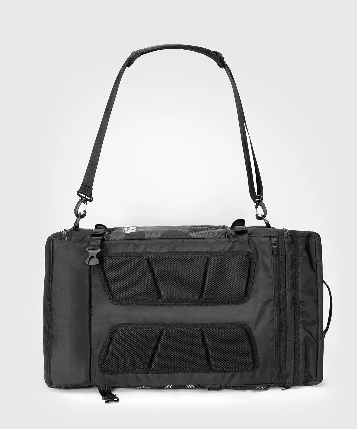 De Venum Sporttas Trainer Hybrid Black met geventileerde vakken die je gear laten ademen, 63L ruimte voor al je spullen, en een 3-in-1 draagsysteem.