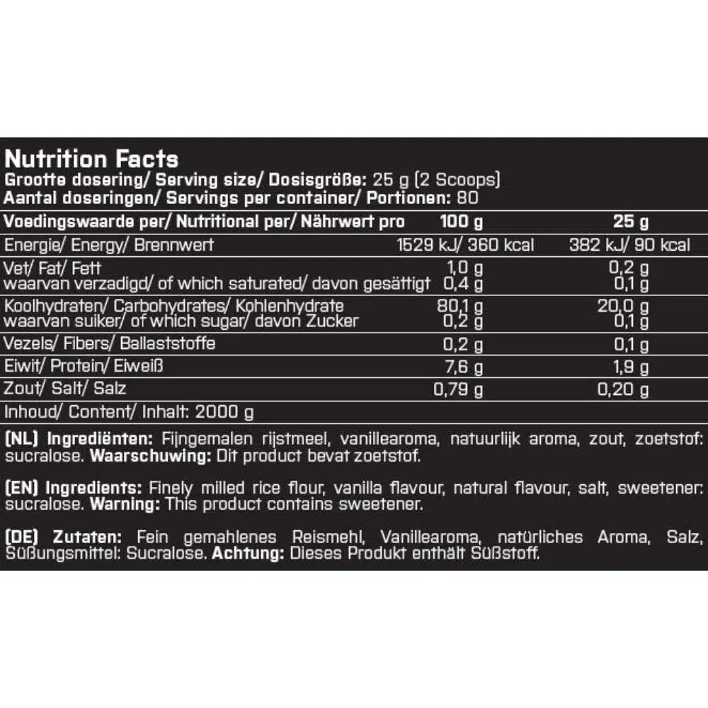Omdat we gebruik maken van niets meer dan fijngemalen rijstmeel, vanille aroma en zoetstof heb je wel de lekkere smaak en textuur, maar niet de extra calorieën. Één serving bevat dan ook maar 90 kcal, geen vetten en suikers en maar liefst 20 gram koolhydraten. Voeg eventueel wat extra kaneel of blauwe bessen toe aan jouw Cream of Rice en je hebt de beste en gezondste rijstepap te pakken.