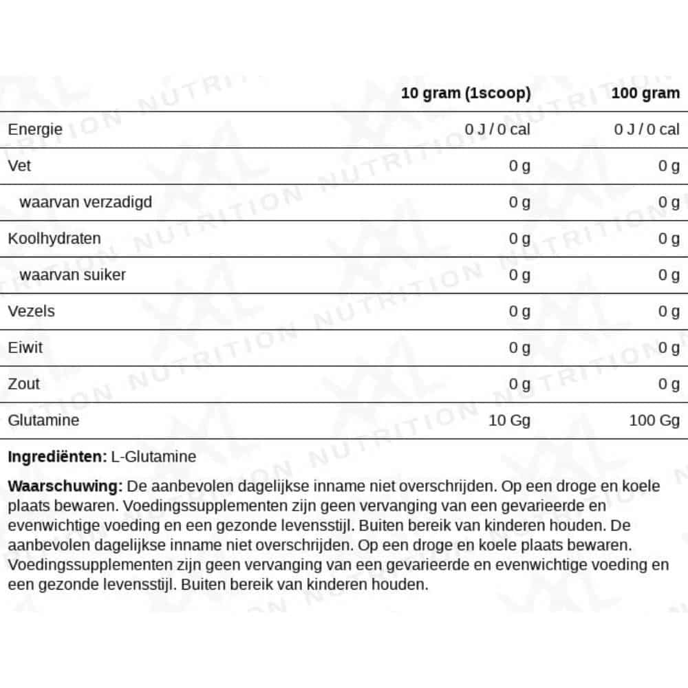 Glutamine is een semi-essentieel aminozuur, wat betekent dat het lichaam deze stof zelf aan kan maken uit essentiële aminozuren zoals BCAA’s. Er zijn echter situaties waarin het lichaam hier onvoldoende toe in staat is, zoals bijvoorbeeld in periodes van zware training of stress. Daarom valt het voor jou als fanatiek sporter aan te raden om te zorgen dat je voldoende glutamine binnenkrijgt, en dit doe je gemakkelijk met de Glutamine van XXL Nutrition. 1 serving van 10 gram Glutamine Unflavored bestaat voor 100% (en dus 10000 mg) uit glutamine in de zuivere L-vorm, zodat je zeker weet dat je jouw lichaam van de meest zuivere vorm glutamine voorziet.