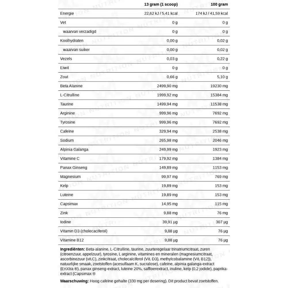 Naast deze actieve ingrediënten barst Black Label Pre-Workout ook van de vitamines en mineralen als Vitamine B12, Vitamine C, Vitamine D3, Magnesium, Zink en Sodium.