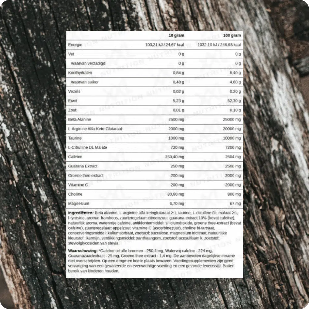 Neem 1 maatschep (10 gram) met 200 ml water 30-45 minuten voor de training. Neem nooit meer dan 1 maatschep per dag.